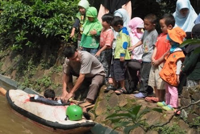 Trus… Ayu akhirnya ikutan deh seperti anak Sekolah Alam lainnya, main lumpur, main di sawah dan main di kolam. Hari Jumat kemaren Ayu ikutan outbound di air. Tapi masih deket sekolah siiih.. Katanya anak-anak mau naik kayak. Ayu sudah siap menunggu giliran, pake topi dan jaket oranye, bekas seragam outbound punya kakak dulu.