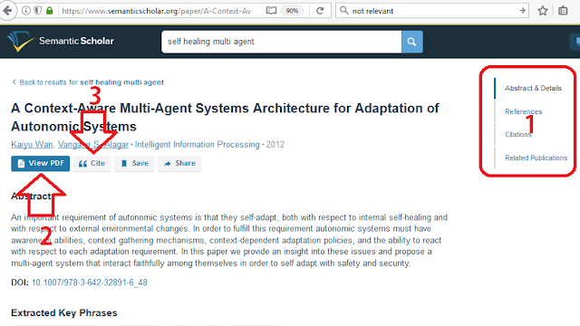 - Overview paper yang memuat abtract, references, citation dan related publication. Citation menampilkan list paper-paper mana yang sudah mensitasi paper ini. Jadi kita bisa melihat apakah paper ini “laku” atau nggak .. Kalo banyak yang mensitasi berarti lumaya lakhuuu… Sedangkan related publication menampilkan paper-paper lain yang isinya diperkirakan relevan, mirip atau masih nyambung-nyambung dikit. Biasanya setelah baca list di related publication, nggak nahaaan langsung wara wiri baca paper-paper tersebut dah akhirnya tersesat binasssaaa karena keblinger sama paper dan galau lageeee.. mana nih yang penting dan nggak penting.. (maaf, personal experience ini maah).